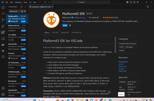 実際のところ 導入 拡張画面で「PlatformIO」を検索し導入 初回だと環境導入のため、PlatformIOのCoreのインストールがはじまる 無事終わったらリロード 左側に気味の悪い例の顔が出現してるのでクリック 色々メニューがでてる Home画面はこんな塩梅 ここか…
